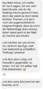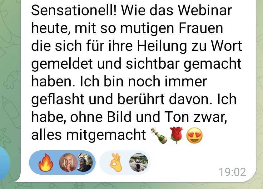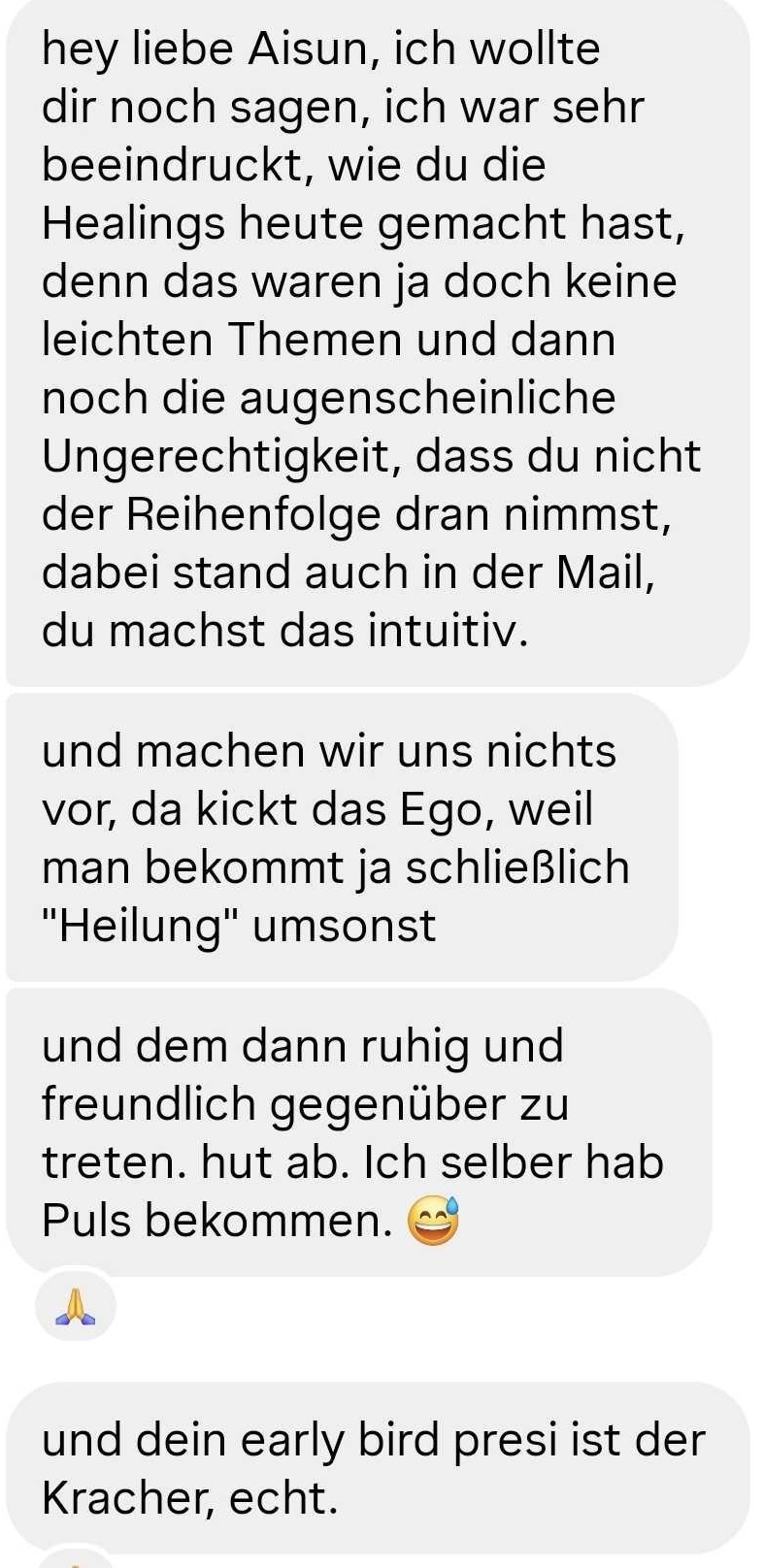„Ich habe an dem Workshop eigentlich nur für mich teilgenommen – aber dann habe ich damit auch bei meinem Sohn herausgefunden, warum er nachts immer Bauchweh hatte. Als Mama gibt es nichts Wertvolleres, als dem eigenen Kind helfen zu können – ohne Arzttermine, Wartezimmer und endlose Sorgen. Danke Aisun, für dieses kraftvolle Werkzeug!“